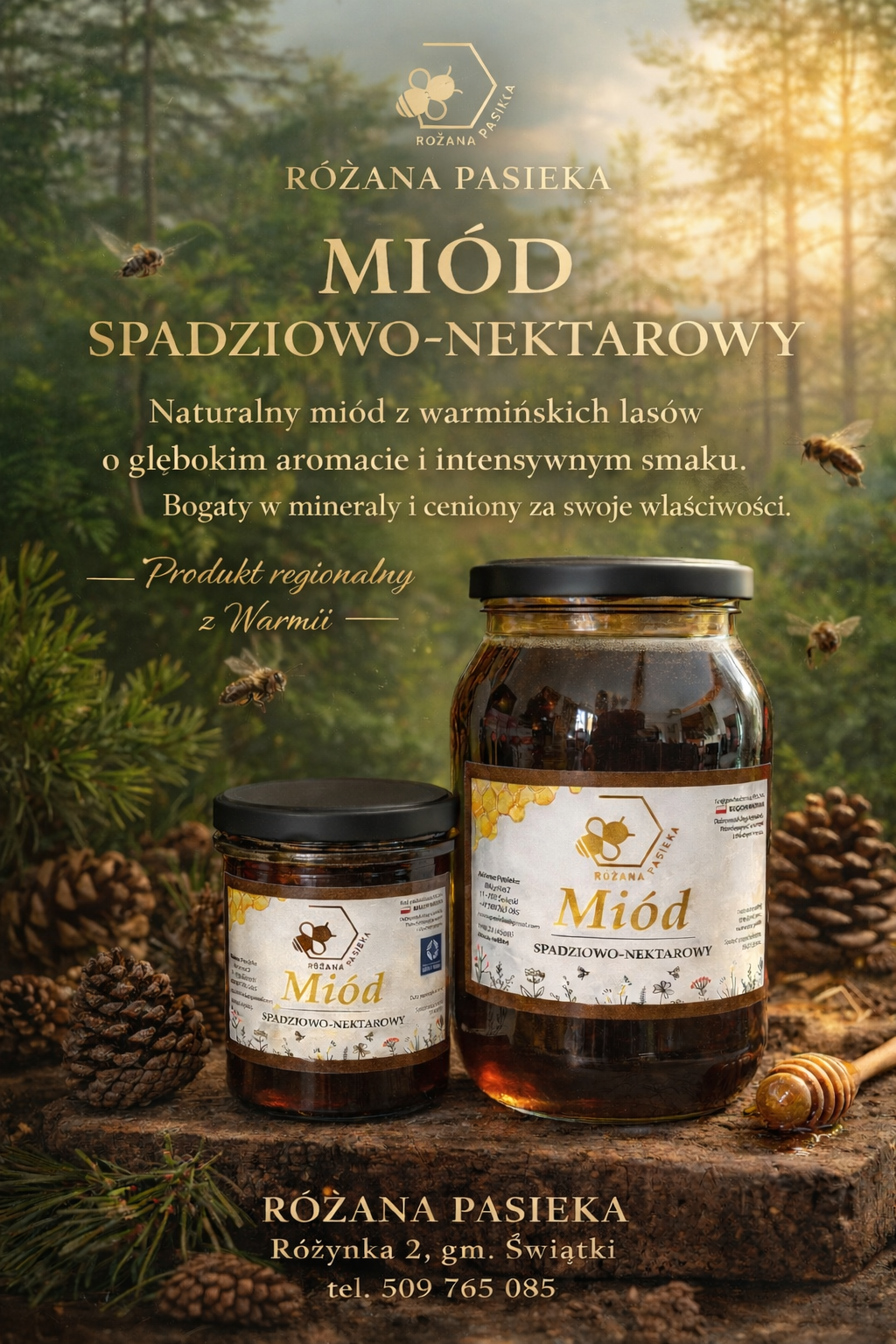 Różana Pasieka to rodzinne gospodarstwo z serca Warmii – regionu znanego z czystej natury, lasów i łąk pełnych pożytków dla pszczół. Pasieka powstała z pasji, która ponad 15 lat temu zaczęła się od jednego ula podarowanego przez wujka. Dziś to rozwinięte gospodarstwo z ponad setką pni, w którym powstają naturalne miody regionalne cenione za swoją jakość i autentyczny smak.